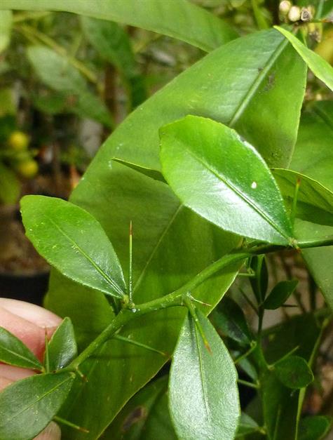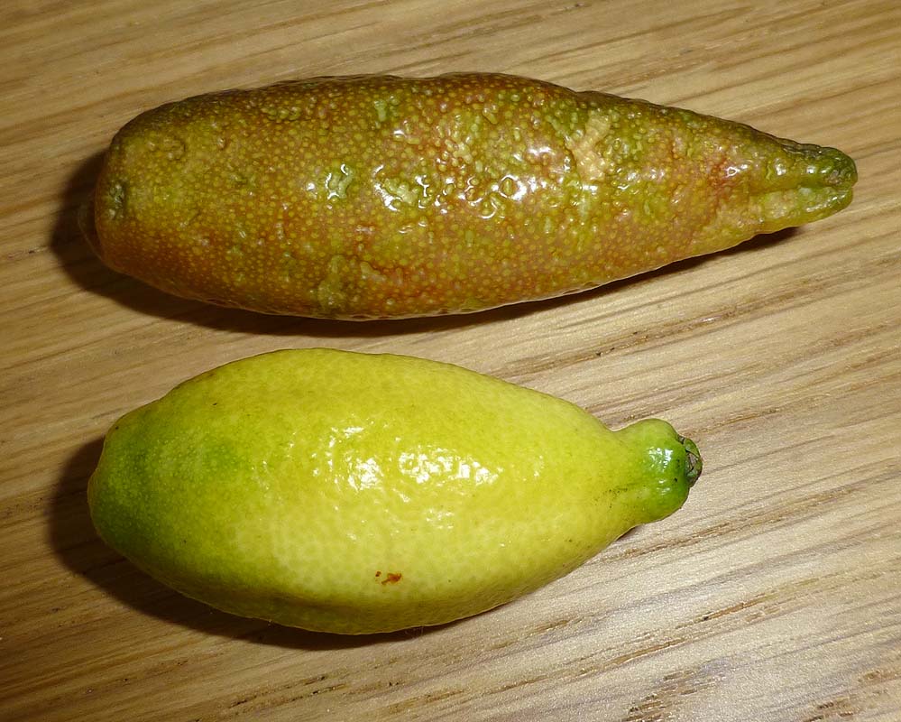 The hybrid fruit, about 7cms long, is at the top, with the yellow Citrus inodora fruit in front for comparison.