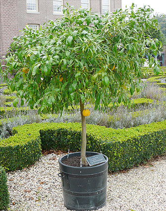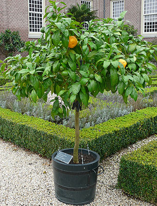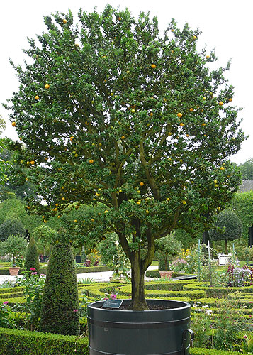 The very first citrus trees to be grown at Het Loo were apparently sold off in 1640, so the earliest ones now date from some ten years later. Many of these trees still survive. They are grown in large circular pots constructed of teak, then painted and covered with a dark-green plastic coating. Strangely, all the citrus trees are in round containers - other species are in the traditional square 'Versailles Planters' usually associated with citrus collections.