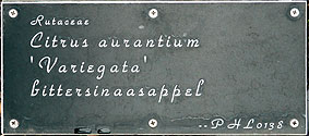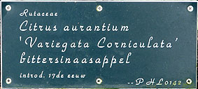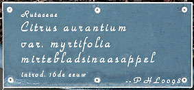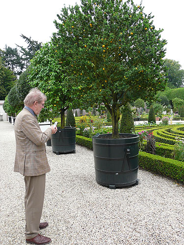 The garden curator standing in front of a magnificent potted specimen of Citrus aurantium myrtifolia - also known as Chinotto, or the myrtle-leaved bitter orange. The tree is about 4m (12') tall. Ben Groen has noted two different forms in the collection. This one is mainly tip-bearing, whereas the other produces fruit along a long section of the branches. There is also a beautiful variegated form of Chinotto. See my web-page about the Dutch National Citrus Collection at Twickel.