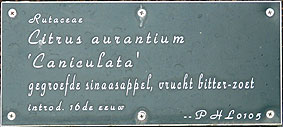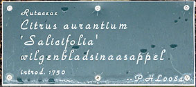 The majority of the trees in the Het Loo collection are Bitter Orange, Citrus aurantium, probably grown from seeds as no graft lines are visible. Ben Groen has tasted fruit from each tree and says that they have a range of sourness from extreme to almost sweet, and that this tends to correlate with the width of the petiole blade - the wider the petiole the more sour the fruit.