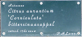 The Dutch National Citrus Collection contained 223 specimens when surveyed in 2008. About 80% of these are Citrus aurantium, the sour or bitter orange, but there are also a few sweet oranges, lemons, citrons, grapefruits, pummelos and calamondins. The following named varieties of Citrus aurantium are included:-