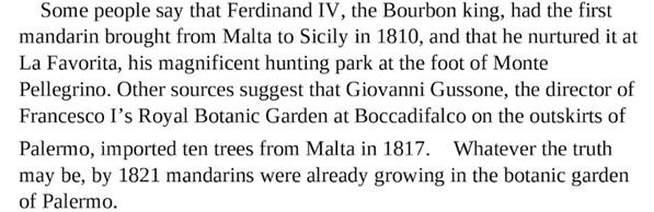 The mandarin is believed to have been introduced into Europe by way of the Royal Botanic Gardens of Kew, England, and the island of Malta, about 1805. The species reached Sicily some time in the following ten years, and soon became a major commercial crop.